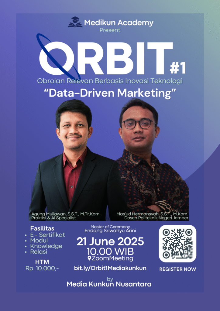 Siap-siap untuk meluncur ke level selanjutnya dan membekali diri dengan skill krusial ini bareng Mediakun Academy! Jangan lewatkan kesempatan emas ini untuk jadi ahli strategi pemasaran yang berbasis data. Yuk, daftar sekarang melalui bit.ly/Orbit1Mediakunkun 💫